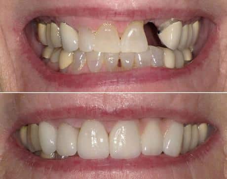 This patient lost a front tooth a few years ago. She was unhappy with her smile. We placed porcelain veneers on her upper 6 teeth and added pink to fix the exposed roots and create a smile she envisioned.
